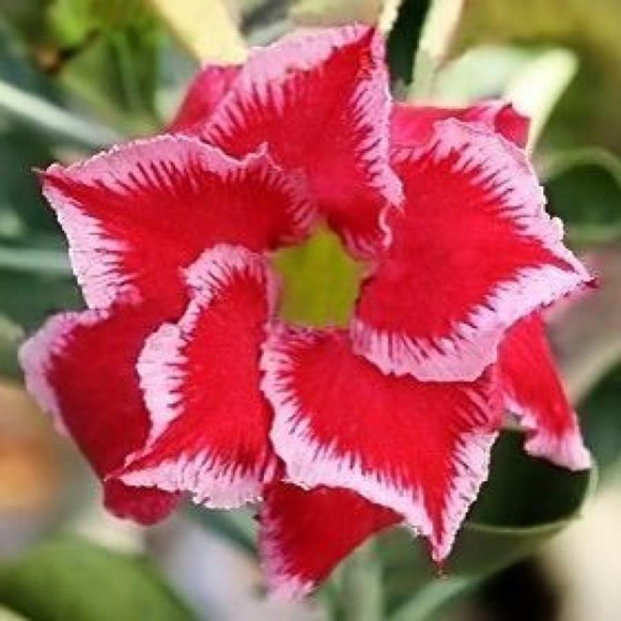 Adenium Double Santa Claus - долгоцветущий сорт. Цветет с апреля по октябрь. Цветки средних размеров, лепестки ярко-красные с белой окантовкой. У бутонов кайма тонкая, голубого оттенка, но за пару дней на ярком солнце она становится практически белой и более широкой.