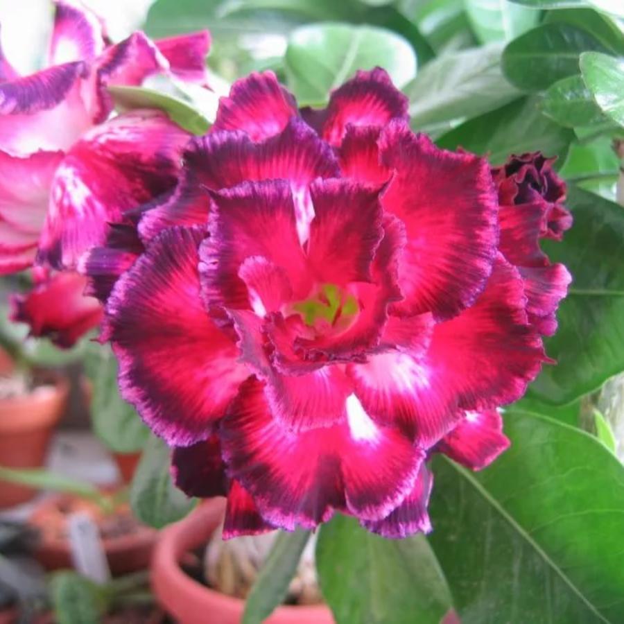 Adenium Pandora - экзотическое миниатюрное дерево. Выращивается как комнатное растение. Отличается очень большими и яркими цветками. Окрас лепестков у основания ярко-красный, далее набирает темно-красного, почти черного цвета. Кайма лепестков насыщенно-розовая.